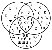 Venn diagram of Greek, Latin and Russian Cyrillic upper case graphemes