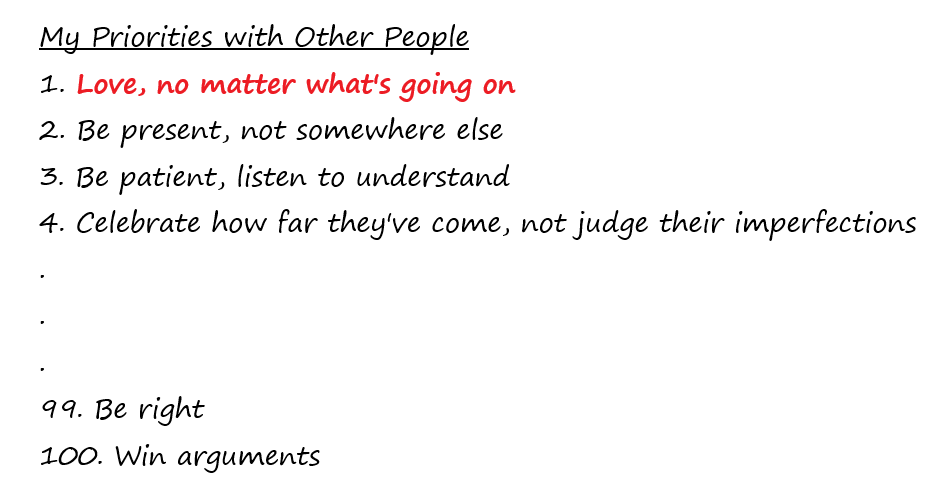 It is more important to be right when you argue with someone else, or do you seek to treat them with love, no matter what is going on? If love is not a priority for you, then humble yourself and strive to make expressing love part of your nature. Your long-term happiness, as well as the happiness of others, depends on it.