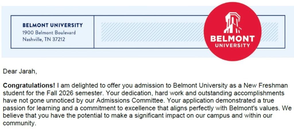 The acceptance letter from Belmont University arrived with news that filled our home with gratitude and wonder. Dr. Chris Gage, Vice President for Enrollment Services, welcomed Jarah into the Fall 2026 freshman class, noting that her “dedication, hard work and outstanding accomplishments have not gone unnoticed.” But it was his next words that felt like God’s own affirmation of our faithful investment: Jarah had been awarded the Belmont Achievement Scholarship, $9,000 annually, selected from “a very talented and competitive group of applicants.”