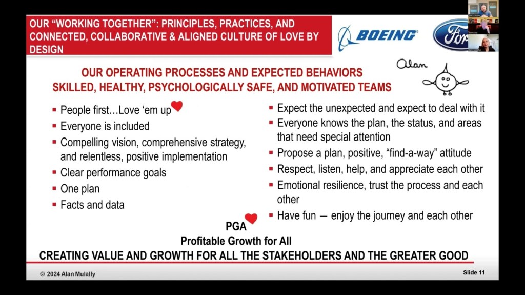 One of Mulally’s core tenets was the concept of joyful accountability. Kindly listen to this short audio clip of Alan explaining his approach. Notice it doesn’t require any special skill, it only requires persistence and discipline. This 4 minute excerpt is taken from Patrick Lencioni’s podcast called Lean in to Discomfort.